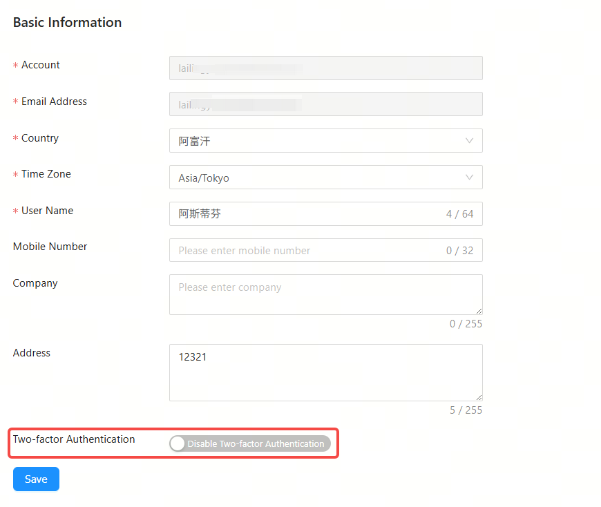 Step 2: You can modify the country, time zone, full name, mobile phone number, company name and address of your account. Also, you can enable or disable the two-factor authentication. After modifying as needed, click Save.