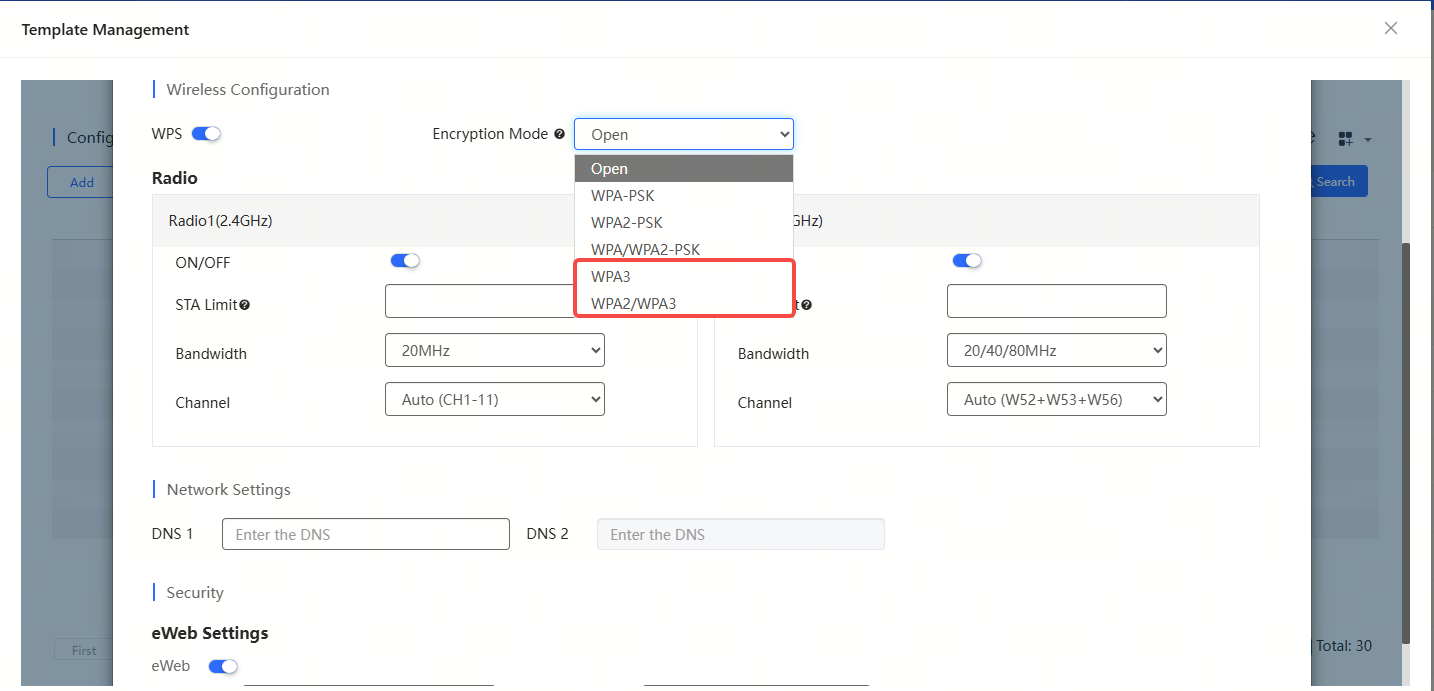 3. Supports setting the encryption mode of RG-AP180-PE/AC (V4), and RG-MA3511-PE/AC to WPA3 or WPA2/WPA3 via an initial configuration template.