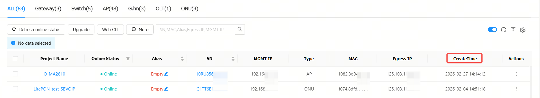 2. Add the Creation Time column to the Device List, showing when a device was imported to the cloud platform.